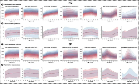 團(tuán)隊(duì)接著運(yùn)用先進(jìn)的統(tǒng)計(jì)模型(GAMLSS),精細(xì)刻畫(huà)了不同大腦指標(biāo)隨年齡變化的動(dòng)態(tài)軌跡。研究發(fā)現(xiàn),癲癇患兒(Epilepsy Patients,EP)的皮層發(fā)育軌跡顯著異于健康對(duì)照(Healthy Controls, HC):其總皮層表面積發(fā)育軌跡異常,皮層厚度在約7歲時(shí)過(guò)早達(dá)到峰值,隨后進(jìn)入持續(xù)變薄階段;同時(shí),其白質(zhì)高信號(hào)負(fù)荷在約8歲時(shí)達(dá)到頂峰。這些發(fā)現(xiàn)共同指向了兒童癲癇存在一個(gè)以皮層成熟異常和白質(zhì)損傷為特征的關(guān)鍵“脆弱窗口期”。