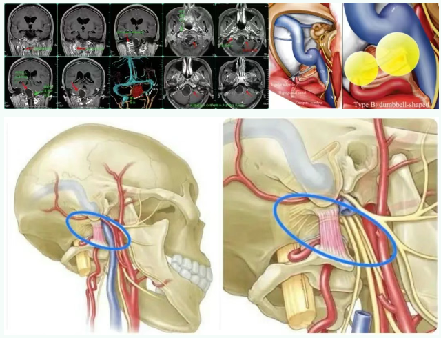 腫瘤位置隱蔽且毗鄰眾多極其重要的神經(jīng)和血管,手術(shù)難度和風(fēng)險(xiǎn)均很大。本次采用的“極外側(cè)-經(jīng)髁-經(jīng)頸靜脈結(jié)節(jié)-經(jīng)上頸部入路”,該組合入路是顱底神經(jīng)外最復(fù)雜的入路之一。
